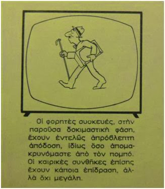12. Το wifi και τα tablets ήταν επιστημονική φαντασία τη δεκαετία του 1960. Αν κρίνουμε και από το σκίτσο, ο «πρωτόγονος» Έλληνας τηλεθεατής ήταν ο πρώτος που απαίτησε φορητότητα. Δικαιώθηκε μετά από πολλές δεκαετίες. Στο μεταξύ όμως έχασε την γκλίτσα που κρατούσε.
